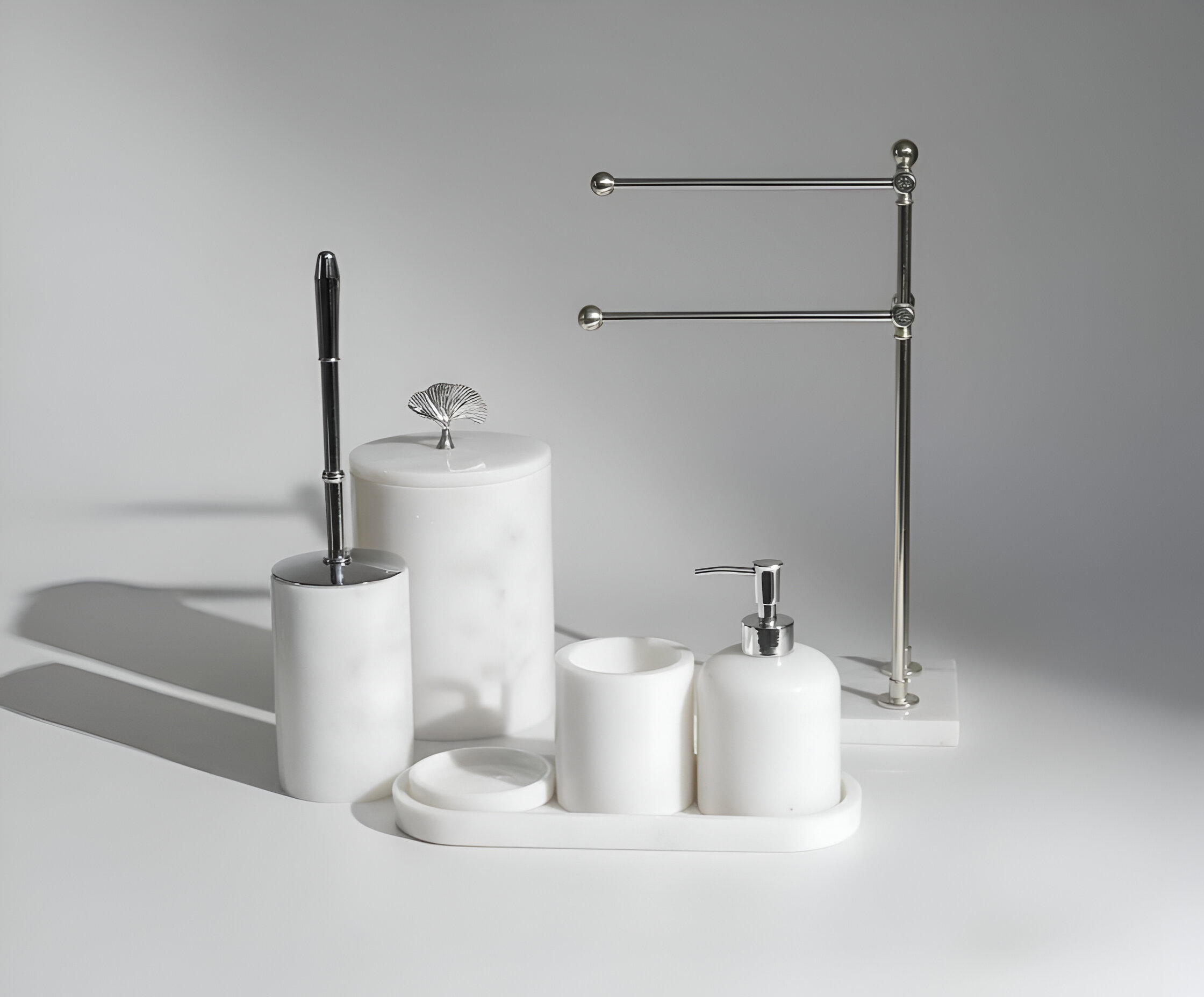 Afyon Beyaz Mermer 5'li Banyo Seti Gümüş Aksesuar