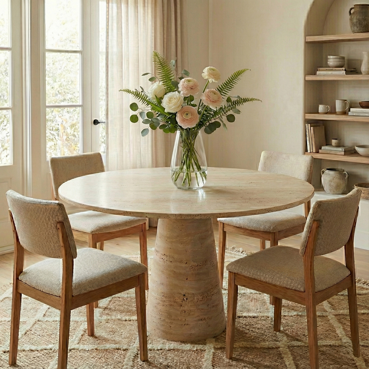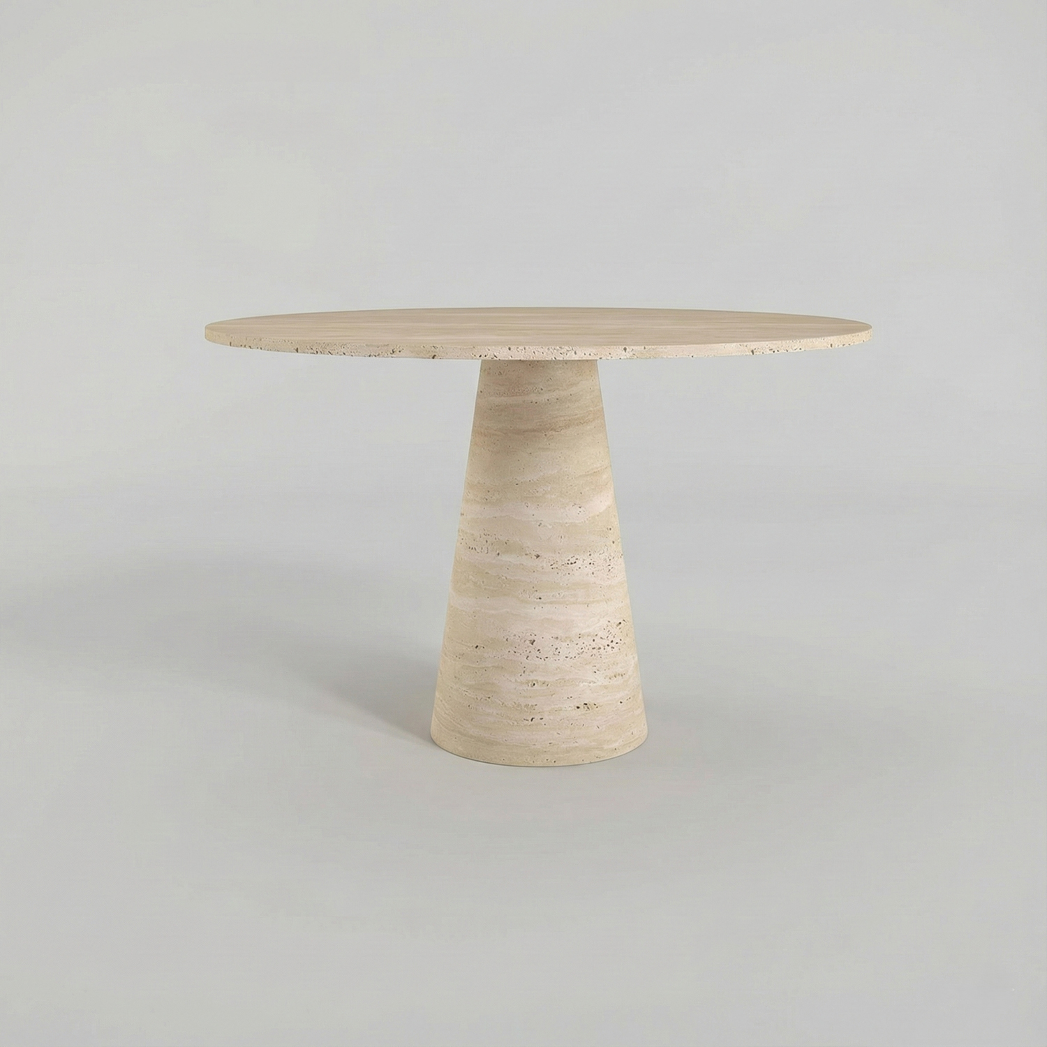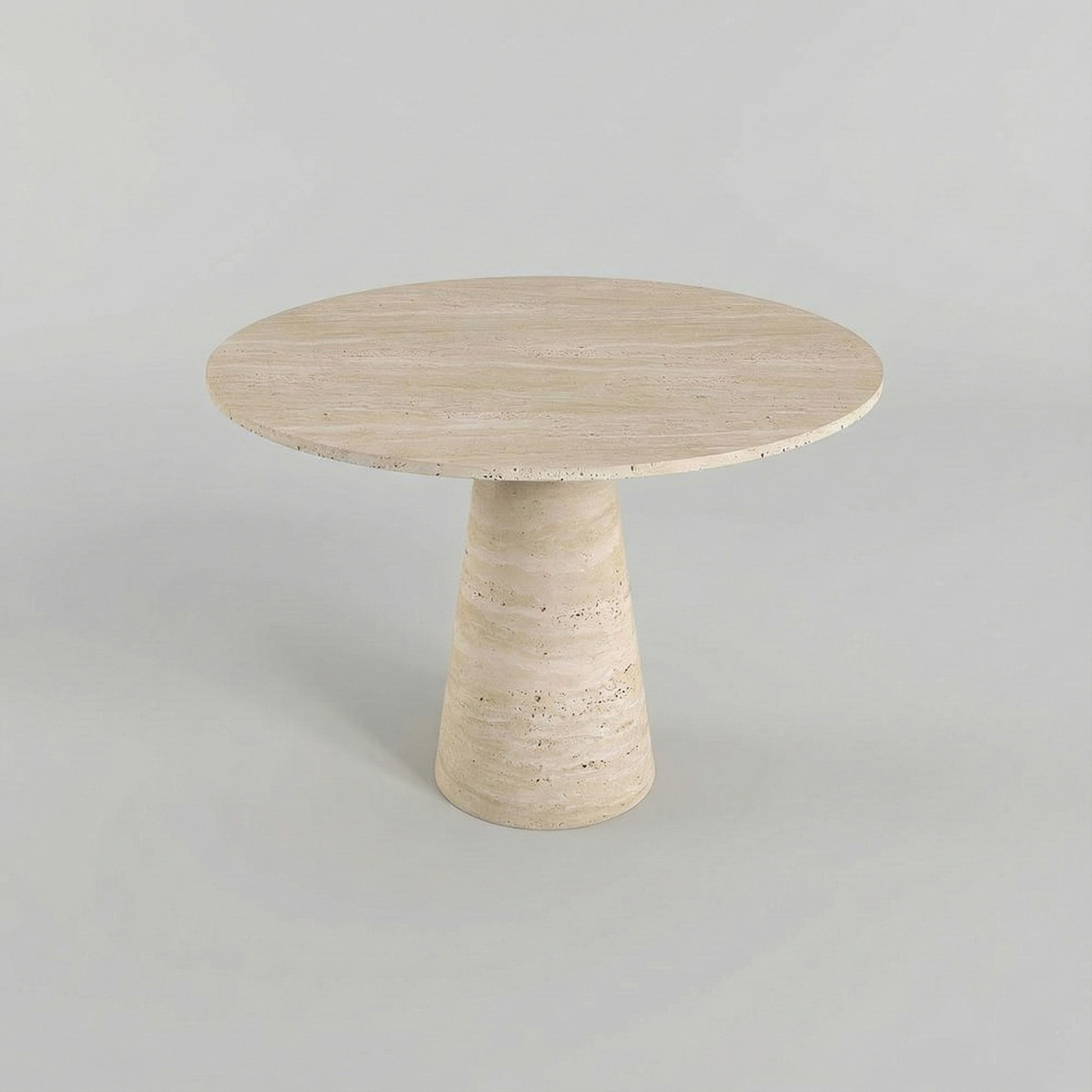 Arroyos Yemek Masası, yuvarlak tabla formunu konik ayak tasarımıyla birleştirerek dengeli ve zarif bir siluet sunar. Traverten yüzeyde görülebilen doğal gözenekler, renk geçişleri ve damar izleri taşın karakterinin doğal bir parçasıdır ve her ürünü benzersiz kılar.