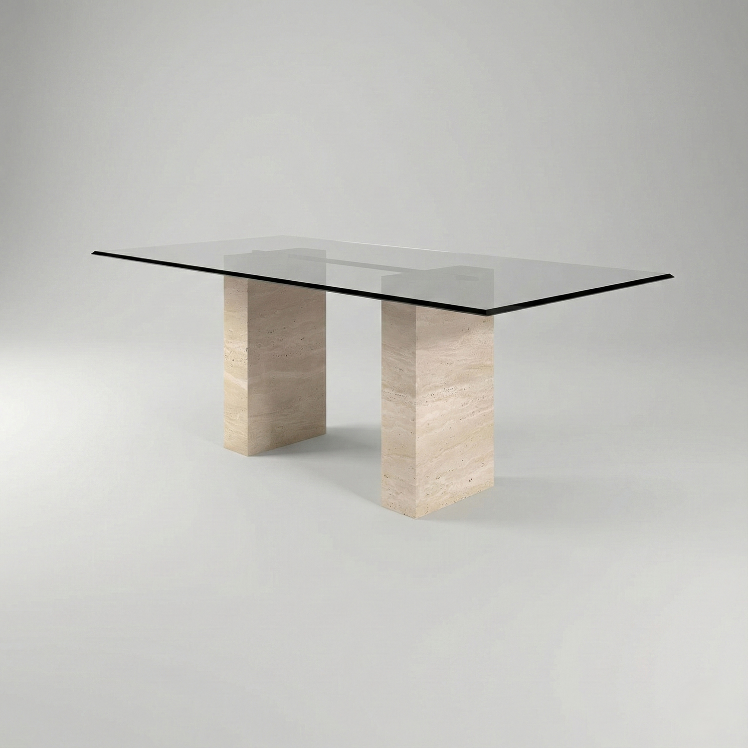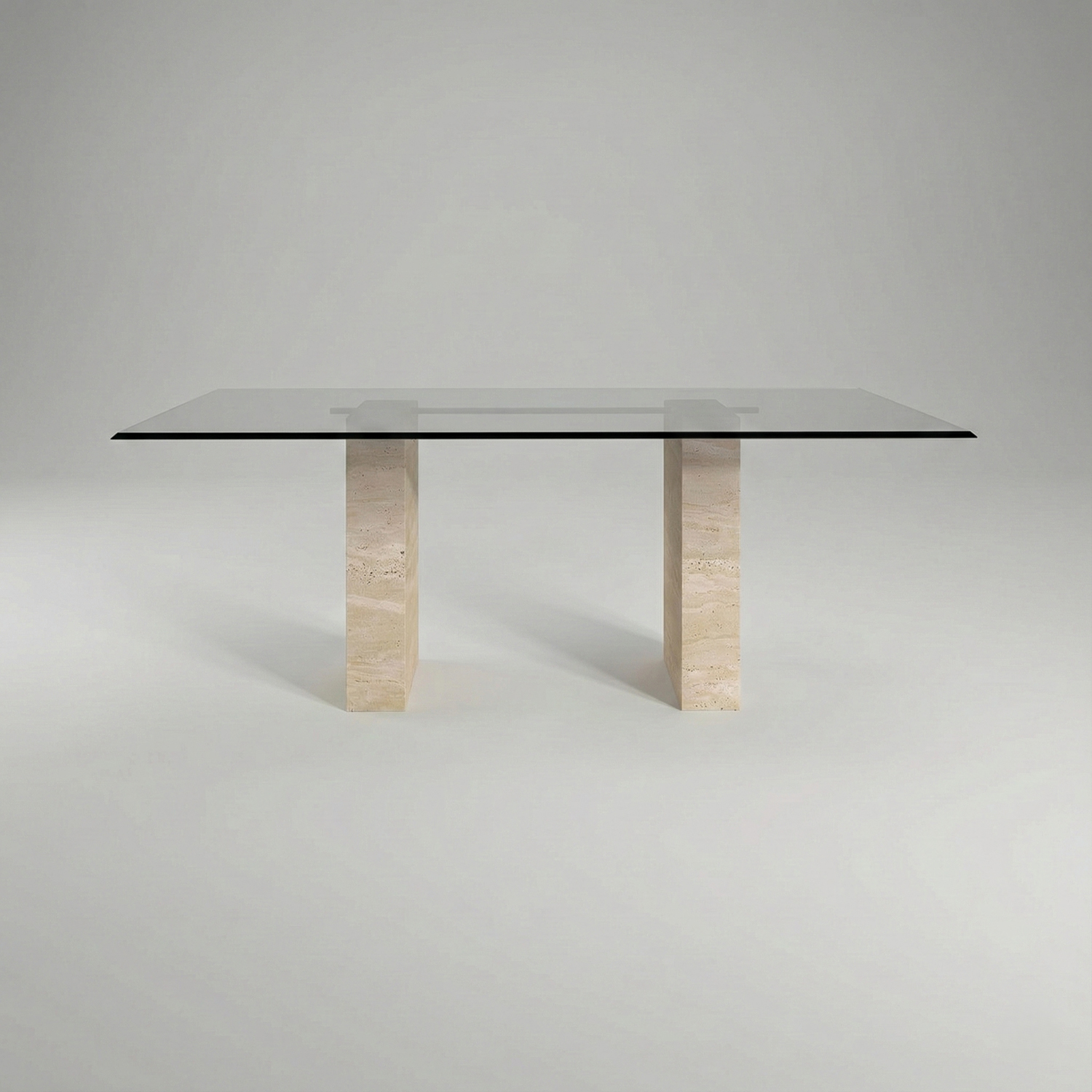 Azul Yemek Masası, şeffaf cam tabla ile traverten blok ayakları bir araya getirerek modern ve dengeli bir tasarım sunar. Traverten ayaklarda görülebilen doğal gözenekler, renk geçişleri ve damar izleri taşın karakterinin bir parçasıdır ve her ürünü benzersiz kılar.