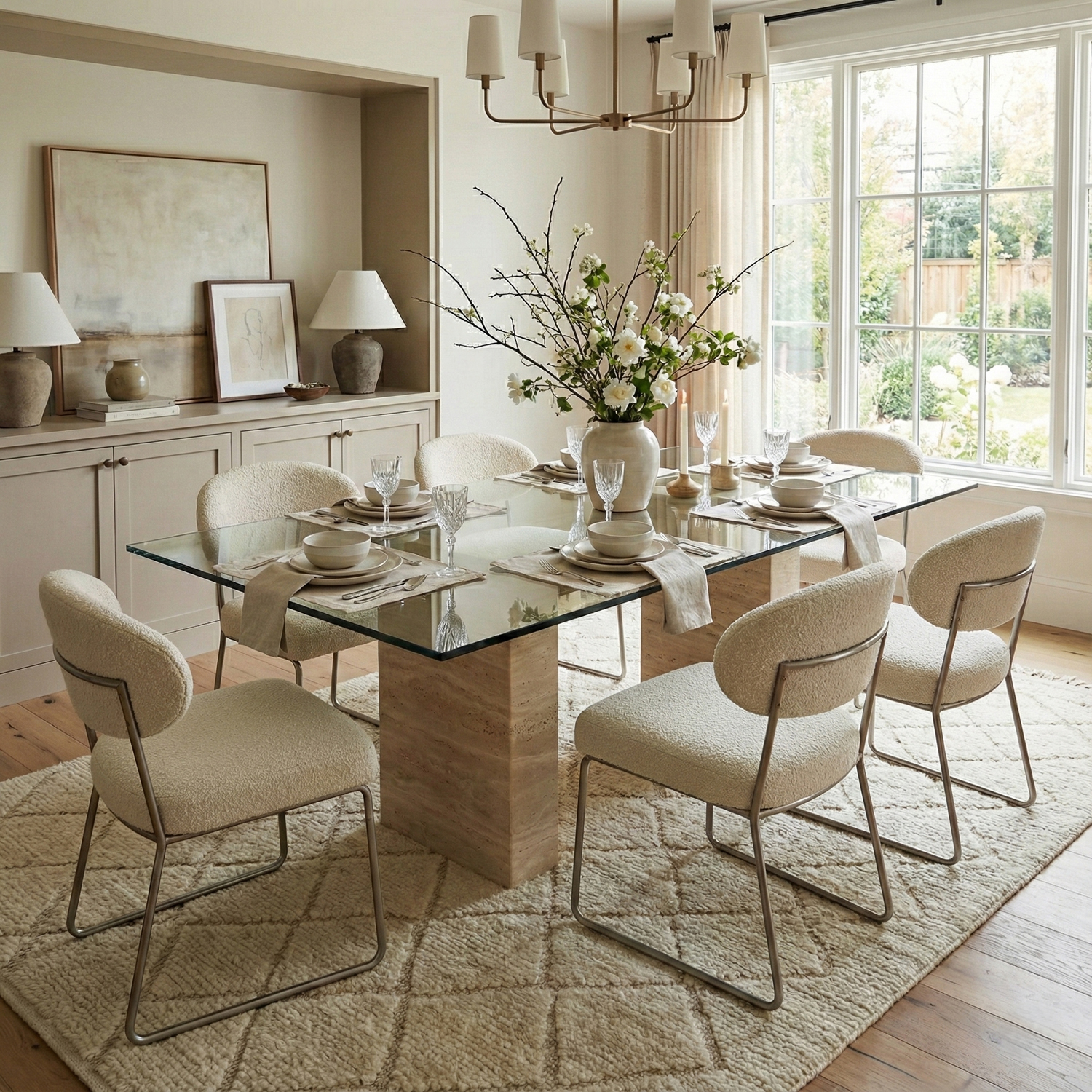 Cam tabla, travertenin doğal dokusunu ön plana çıkarırken mekâna ferah ve hafif bir etki kazandırır. Azul Yemek Masası, çağdaş ve zamansız bir stil arayan yaşam alanları için ideal bir tercihtir.
