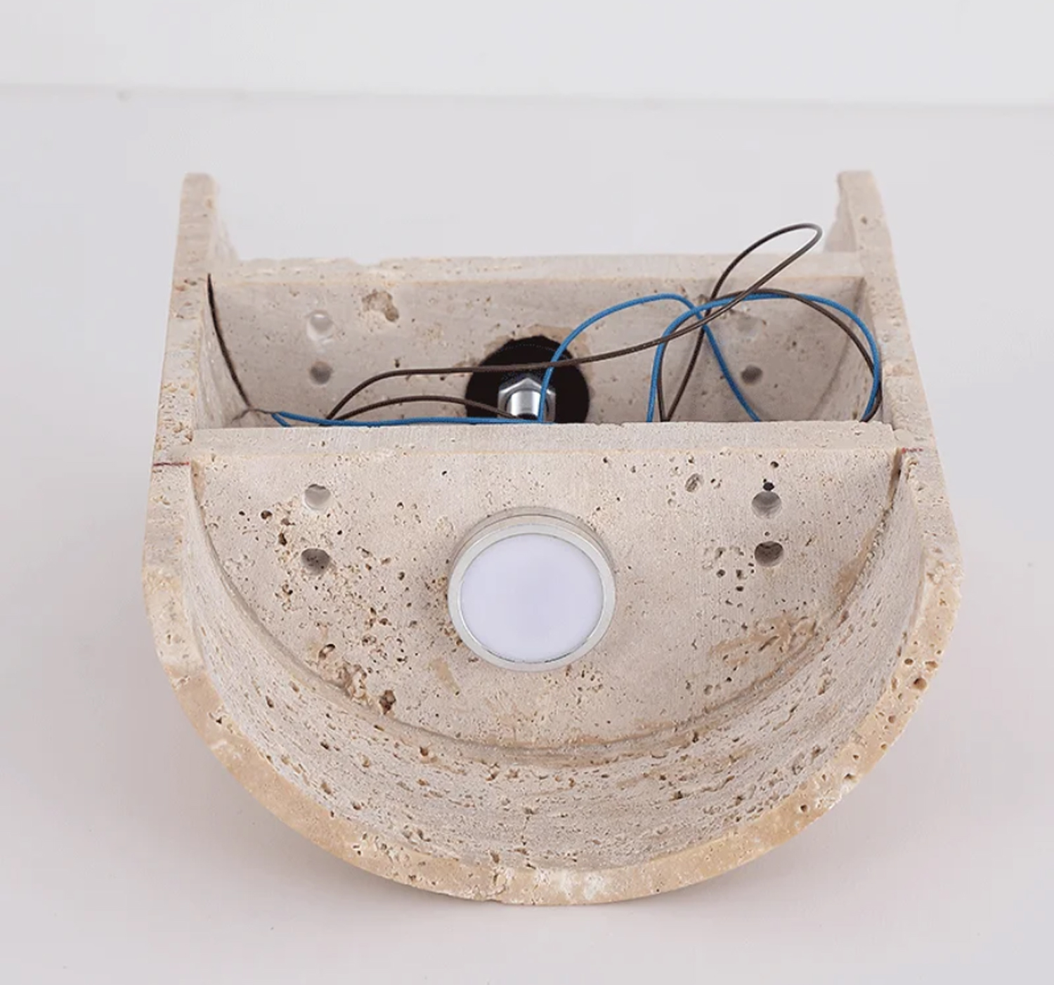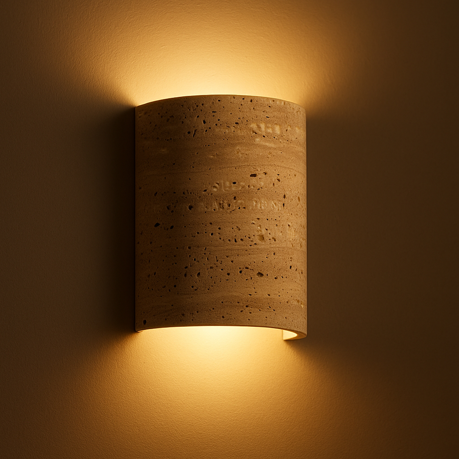 Duvar üzerinde sıcak ve dengeli bir aydınlatma etkisi oluştururken, sade formu ile modern ve zamansız mekanlara kolayca uyum sağlar. Doğal taşın kendine özgü gözenekli yapısı sayesinde her ürün benzersizdir.