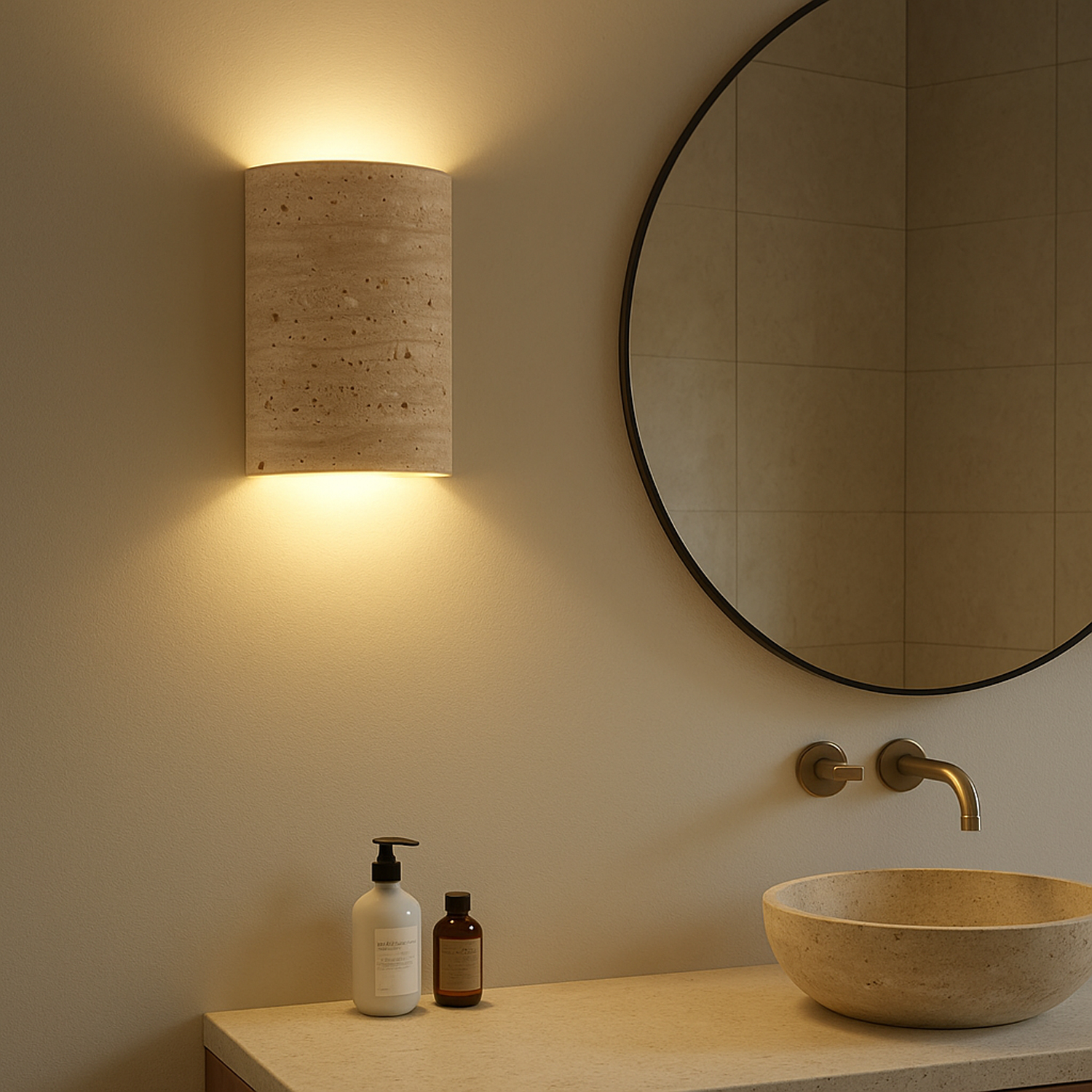 Silindirik formda tasarlanan LULE Duvar Apliği, travertenin doğal dokusu sayesinde ışığı yukarı ve aşağı yönlü yumuşak bir şekilde yayar.