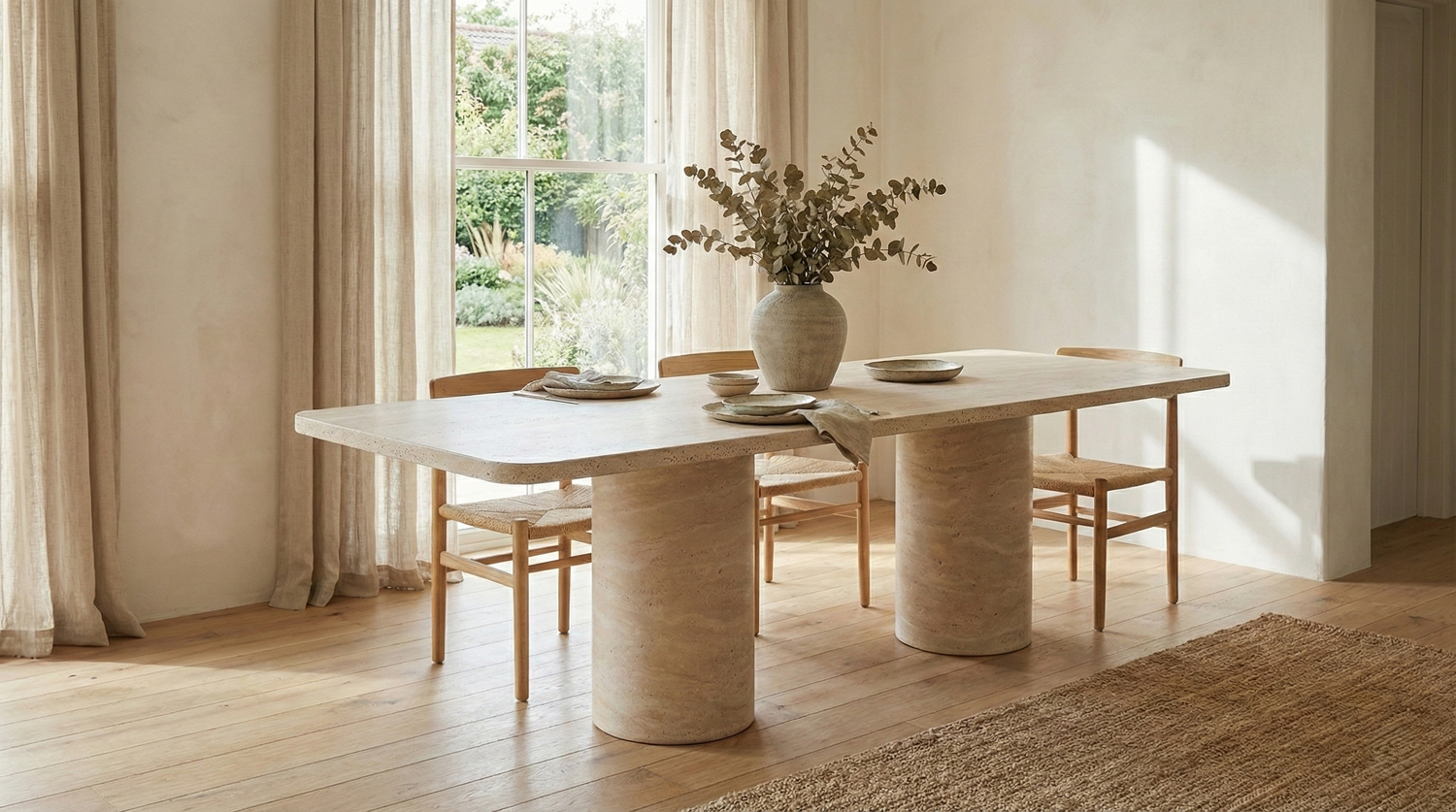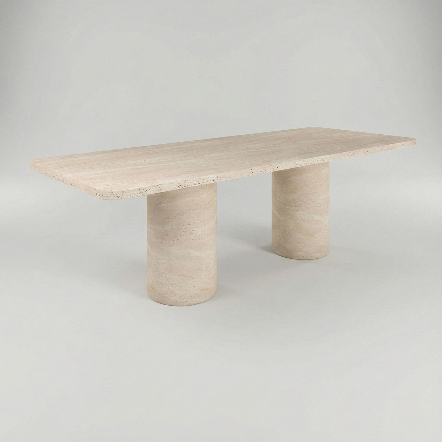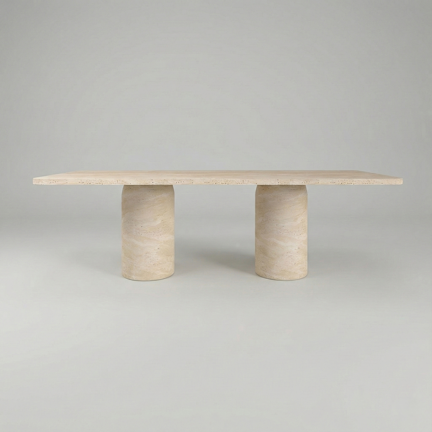 Pilar Yemek Masası, travertenin doğal dokusunu yalın ve güçlü bir tasarımla bir araya getirir.