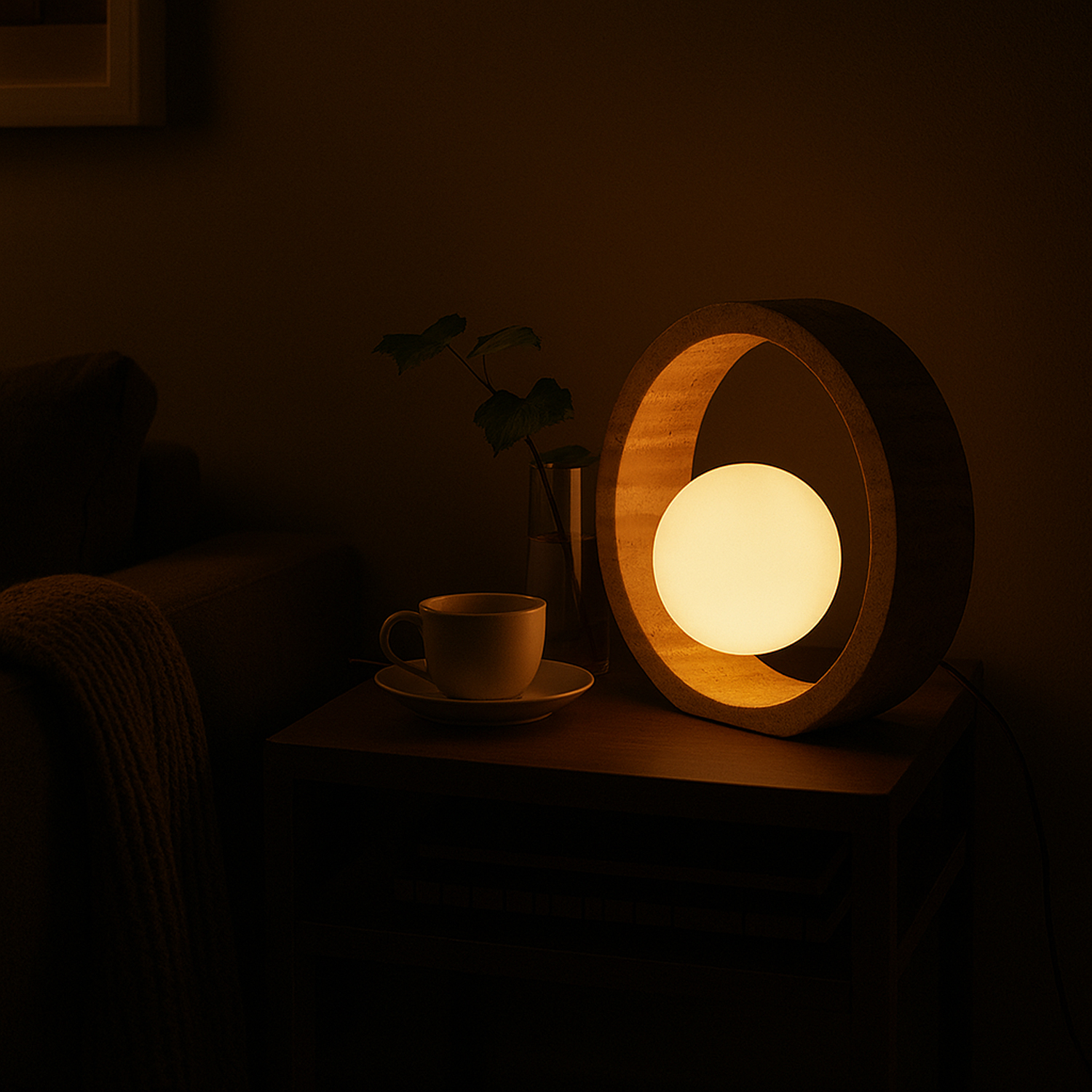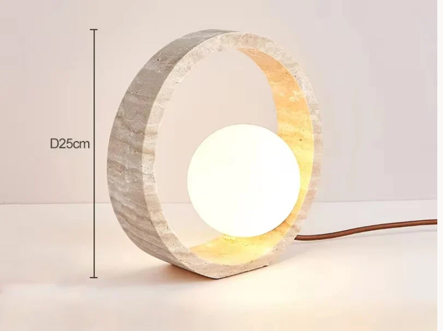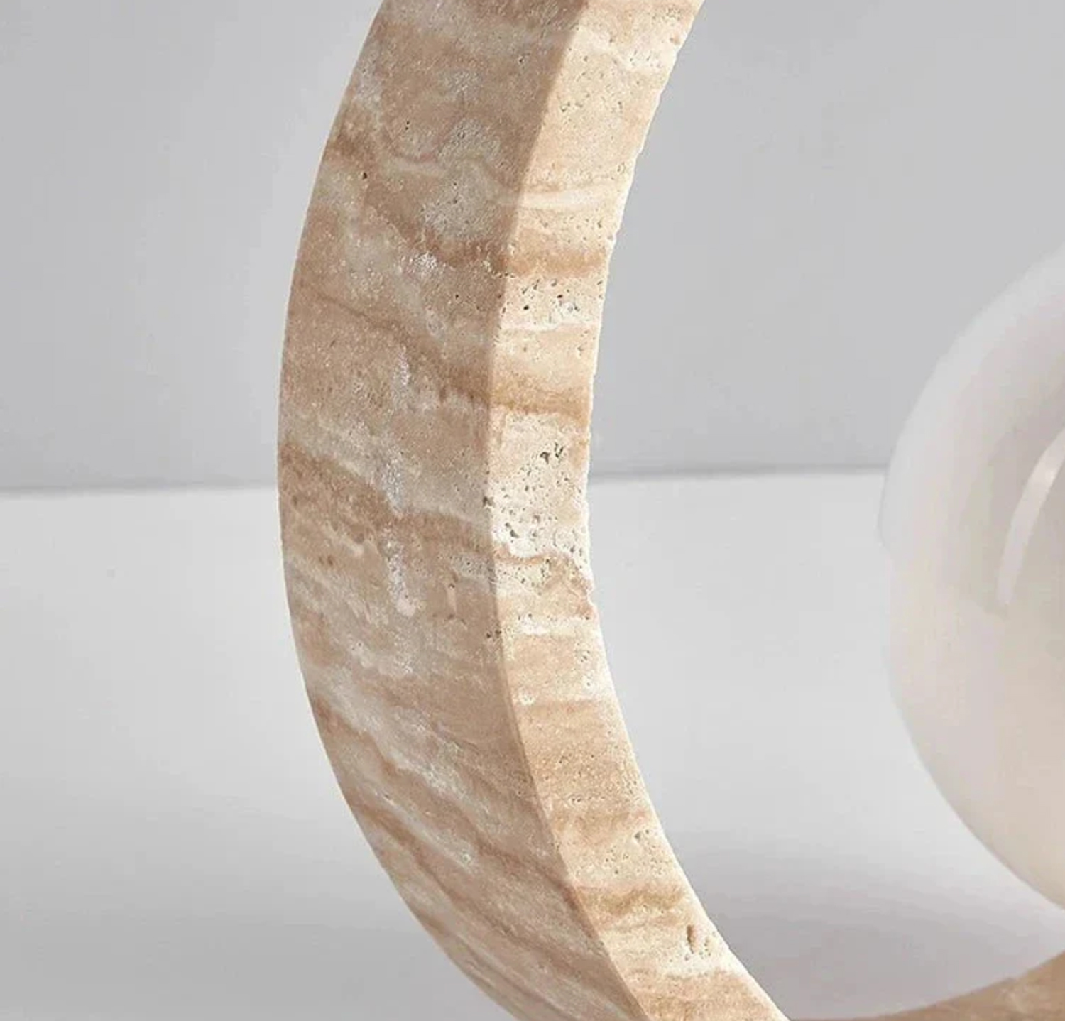 RIGA Masa Aydınlatması, dairesel traverten formu ve merkezde konumlanan opal küre ışık kaynağıyla mekânda sıcak ve dengeli bir ambiyans oluşturur.