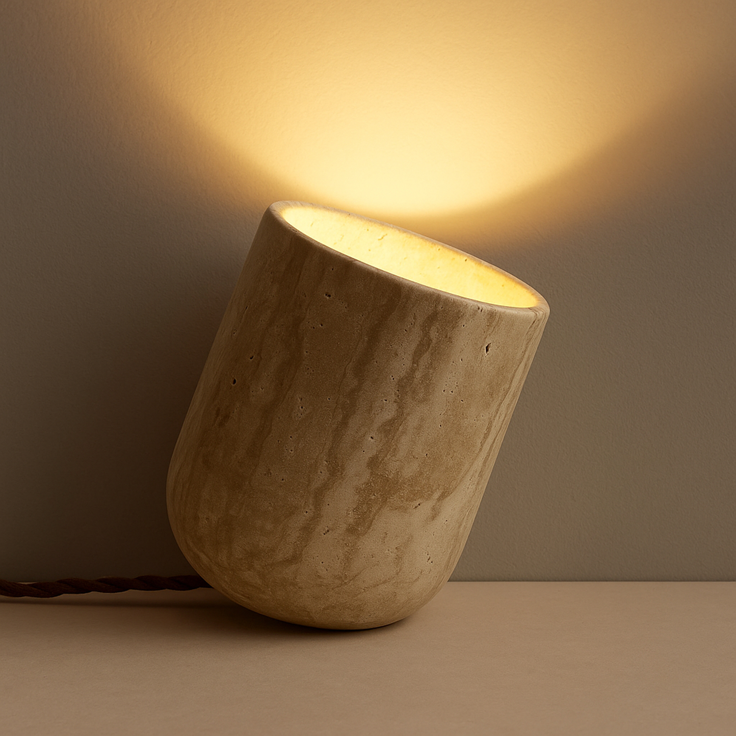 SUND Masa Aydınlatması, eğimli traverten formu sayesinde ışığı tek yöne odaklayarak mekânda sıcak ve yumuşak bir aydınlatma etkisi oluşturur.