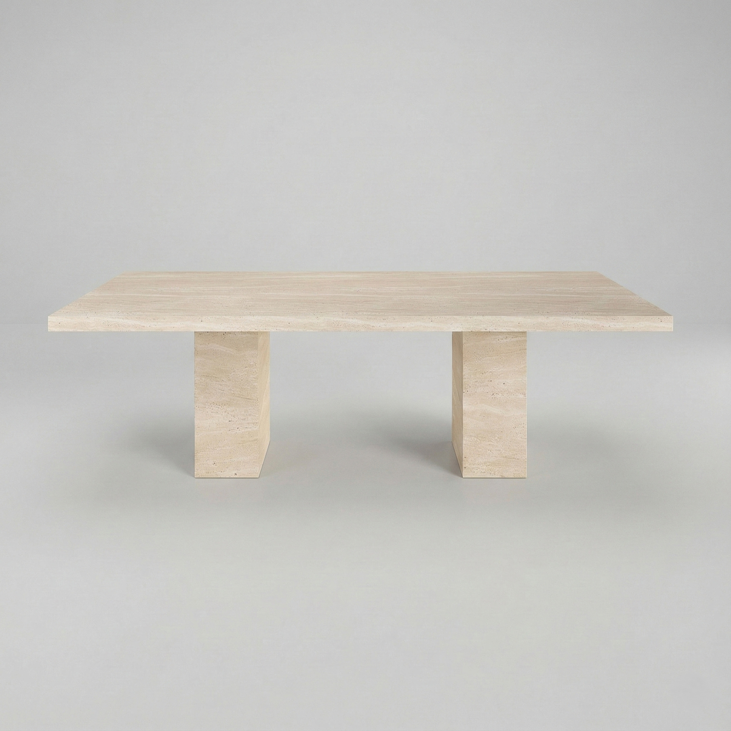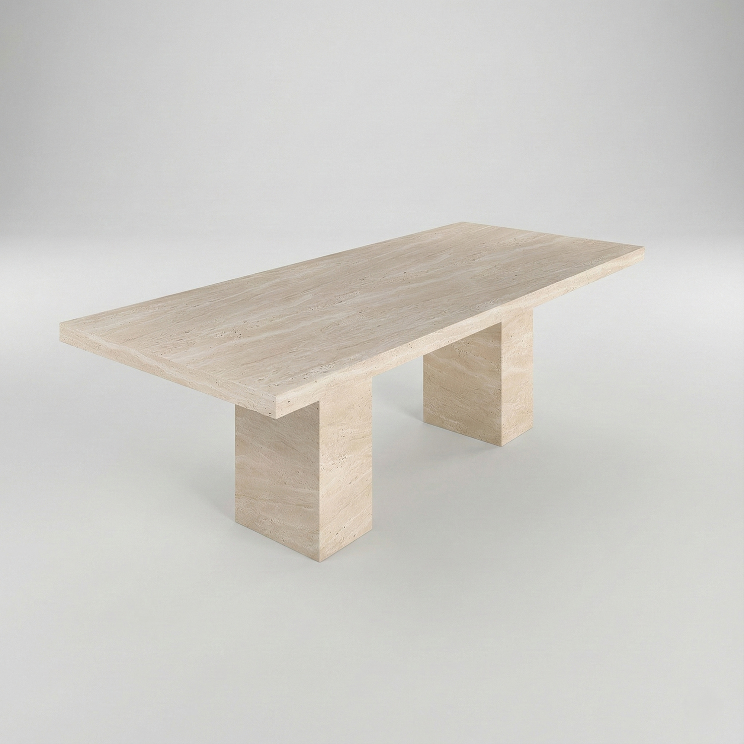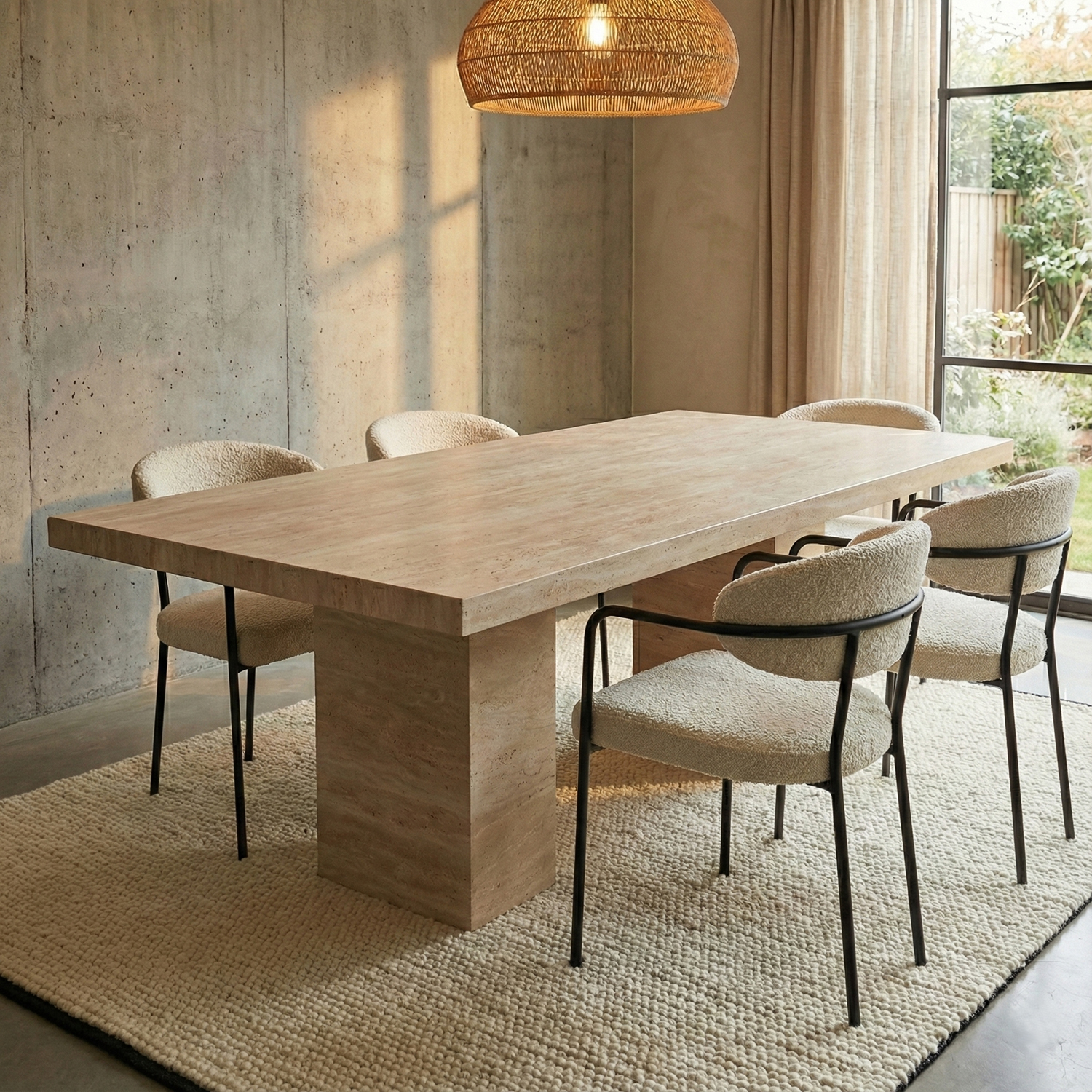 Travertenin doğal dokusu, renk geçişleri ve damar yapısı sayesinde her Trenque Yemek Masası kendine özgüdür.