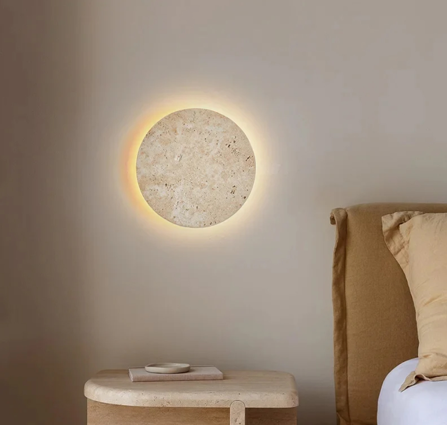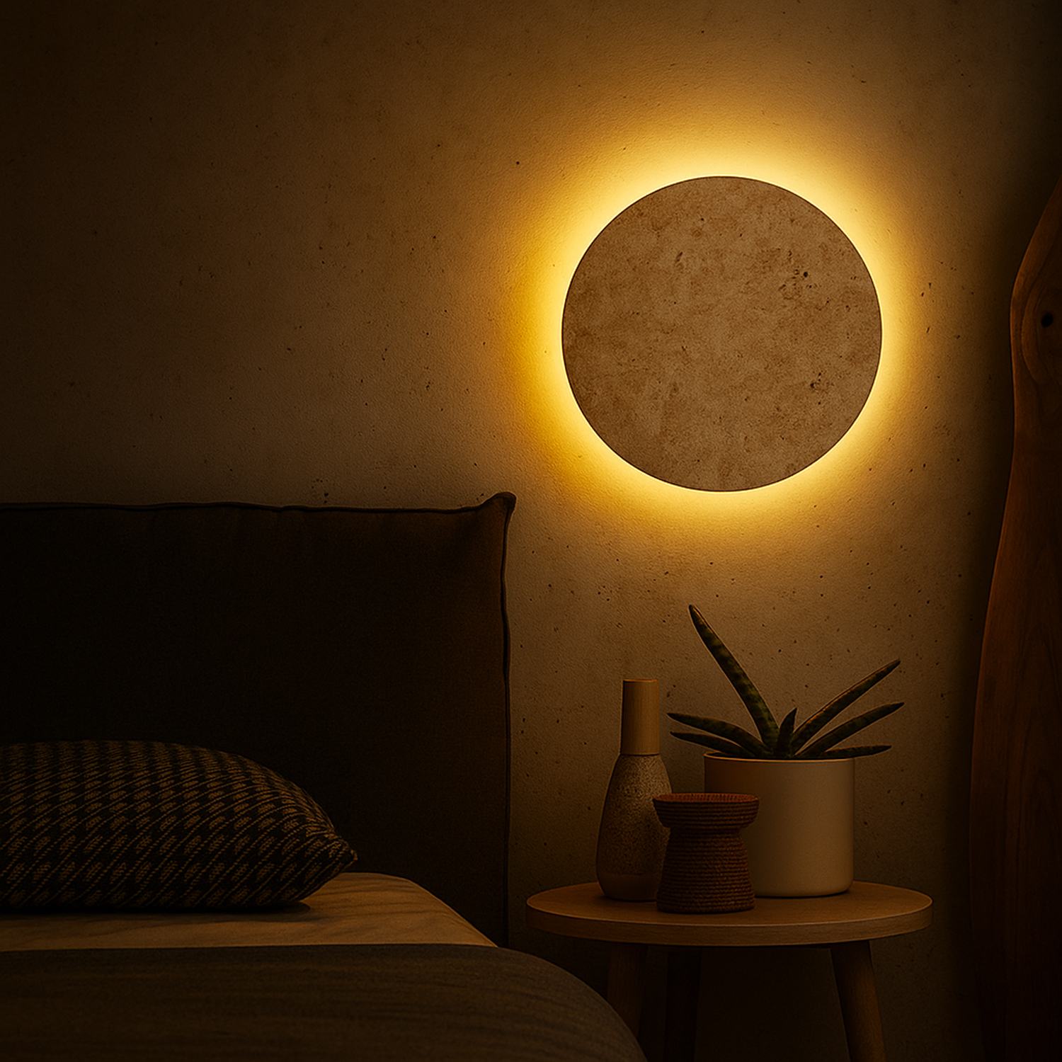Dairesel formda tasarlanan VAASA Duvar Apliği, traverten taşın doğal dokusu sayesinde duvar üzerinde yumuşak ve homojen bir ışık halkası oluşturur.